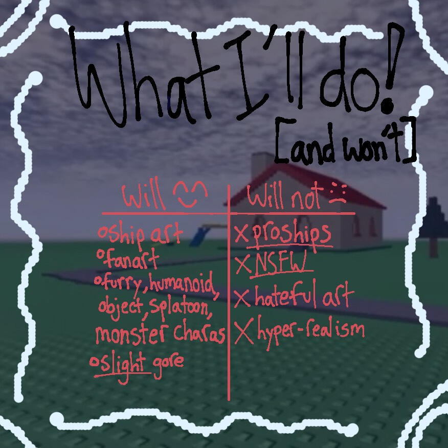 note: I will literally draw anything you'd like me to! As long as it fits into my criteria and give me the resources i need, you and i will be golden!